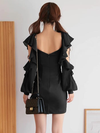 5. 【Angel R/エンジェルアール】フェミニン バストカット 長袖 フリル スリット パールチェーン ビジュー タイトミニドレス (AR25871)