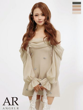 キャバドレス Angel R エンジェルアール 肩あき シアー 長袖 リボン フラワービジュー バイカラー フェミニン 2way オフショルダー フレアミニドレス