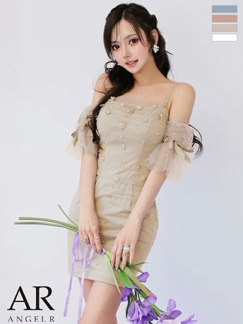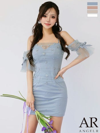 キャバドレス Angel R エンジェルアール メッシュ ベアトップ ビジュー オフショル風 フラワー リボン フェミニン シアースリーブ キャミソール タイトミニドレス