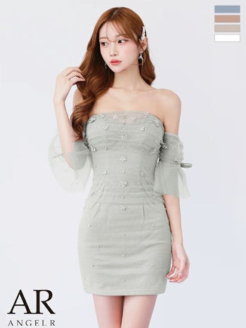 XSあり!ベアドレスとしても♡ 【Angel R/エンジェルアール】シアースリーブ キャミソール メッシュ ベアトップ ビジュー オフショル風 フラワー リボン フェミニン タイトミニドレス (AR26306)