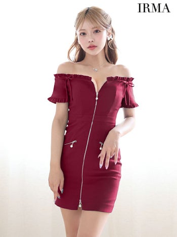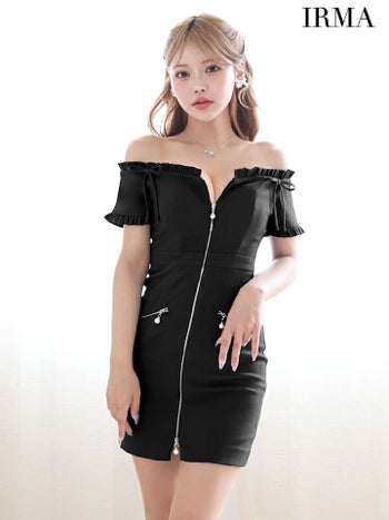 キャバドレス IRMA イルマ リボン ジップデザイン ラメ フリル ストレッチ オフショルダー タイトミニドレス