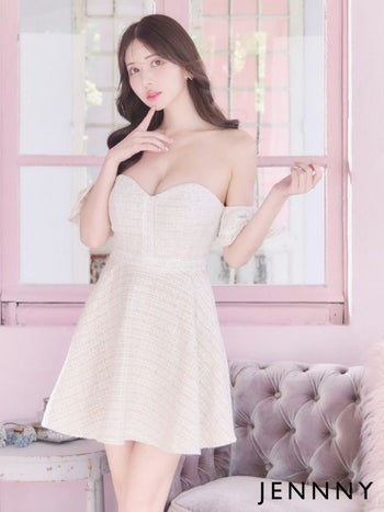 キャバドレス JENNY オフショルダー ツイード ガーリー ホワイトレース ハイウエスト切替 フレアミニドレス