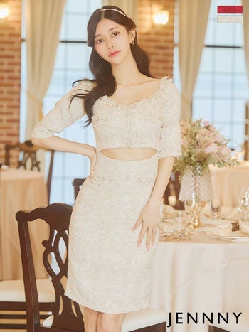 Lあり!sexyなウエストカットデザイン☆ SALE【JENNNY/ジェニー】チェック柄 袖あり ウエストカット ツイード タイト 膝丈ドレス