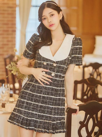 3. 【JENNNY/ジェニー】半袖 チェック柄 ツイード ビックカラー フレアミニドレス