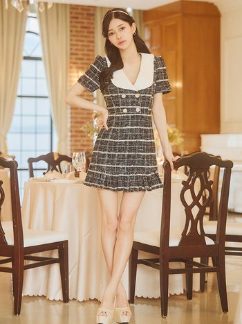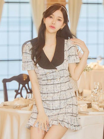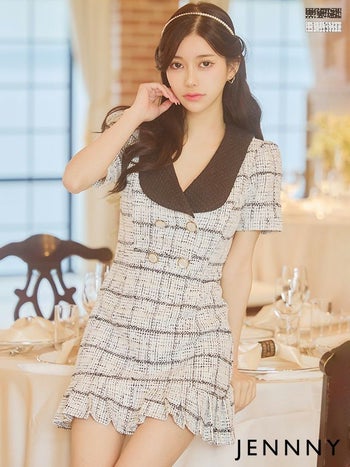 キャバドレス JENNNY ジェニー 半袖 チェック柄 ツイード ビックカラー フレアミニドレス