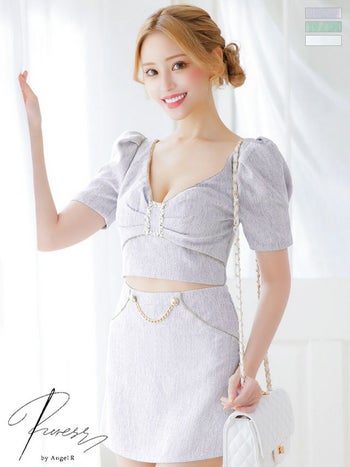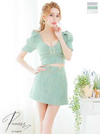 XSあり!バストギャザーがCUTE☆ 【PURESS/ピュアレス】バストビジュー リボン パフスリーブ 半袖 パールチェーンバックル ツイード セットアップ フレアミニドレス (PS802407)
