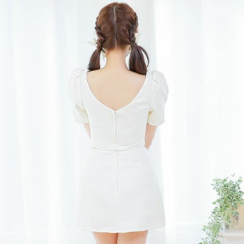 3. 【PURESS/ピュアレス】バストビジュー リボン パフスリーブ 半袖 パールチェーンバックル ツイード セットアップ フレアミニドレス (PS802407)