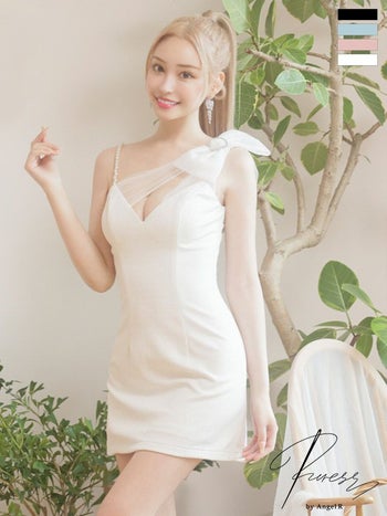 キャバドレス PURESS アシンメトリー パール チェーン キャミソール ビジュー フェミニン リボン ショルダー フレアミニドレス