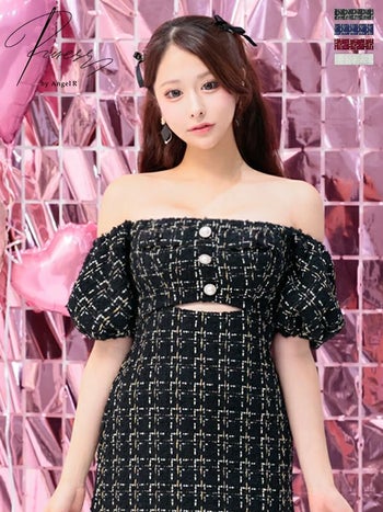 キャバドレス PURESS ピュアレス ミニドレス パフスリーブ パールショルダー キュート ツイード オフショルダー 台形スカート フレアミニドレス