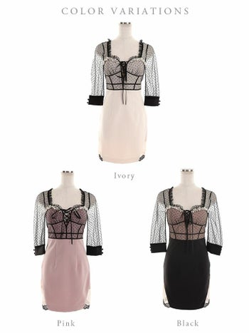 XS~Lあり!編み上げリボンとドットチュールがガーリーなキャバドレス♪ SALE【ROBEdeFLEURS/ローブドフルール】ドットチュール 袖あり シースルー タイトミニドレス(FM2298)