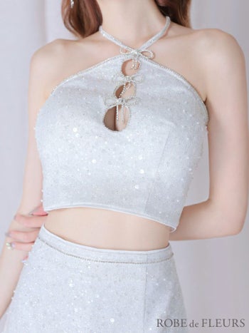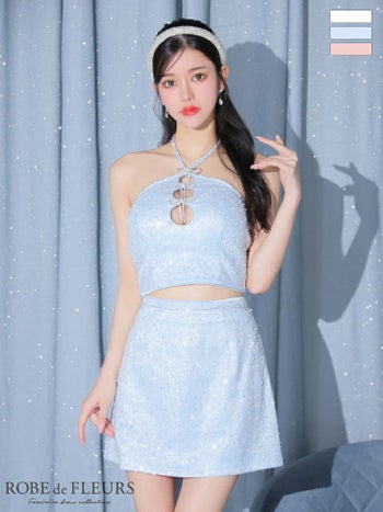 XSあり!煌めきが美しい♪ 【ROBEdeFLEURS/ローブドフルール】トリプルリボン ホルターネック セットアップ ガーリー ラメ フロントホール フレアミニドレス (fm3228)