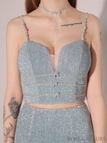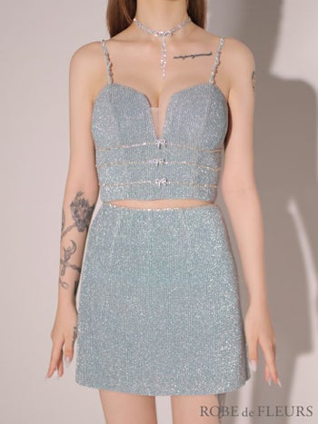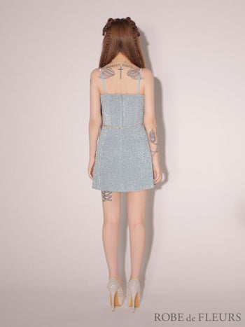 4. 【ROBEdeFLEURS/ローブドフルール】ラメニット ミニリボン ガーリー ビジュー キャミソール セットアップ タイトミニドレス (fm3271)