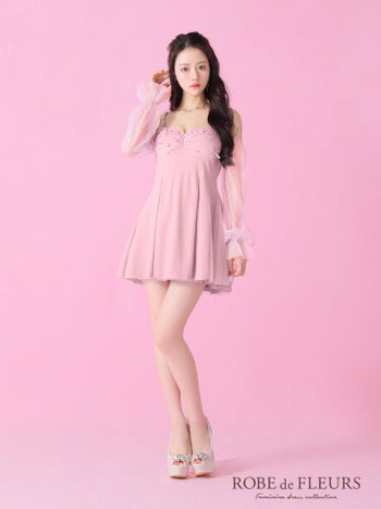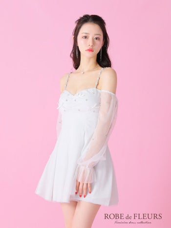 キャバドレス ROBEdeFLEURS ローブドフルール オープンバスト 肩あき 長袖 シアー チュール リボン ラメニット ガーリー フレアミニドレス