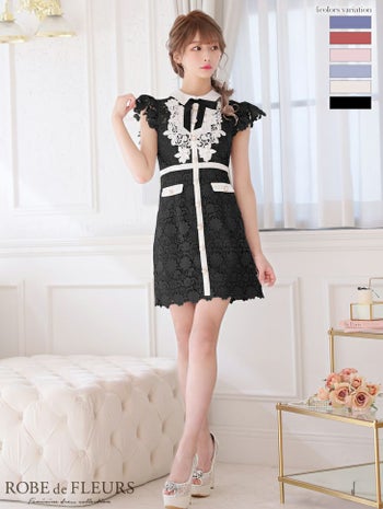 3. 【ROBEdeFLEURS/ローブドフルール】襟付き フラワーレース リボン バイカラー 袖あり ボタン タイトミニドレス (fm3309)