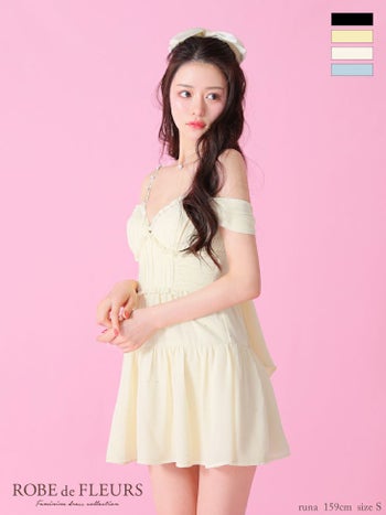 XSあり!女の子らしい印象に♪ 【ROBEdeFLEURS/ローブドフルール】ラメシフォン ガーリー オープンバスト 肩あき フレアミニドレス (fm3381)