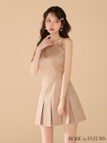 3. 予約商品【2月中旬入荷予定】【ROBEdeFLEURS/ローブドフルール】ビジュー キャミソール リボン ボックスプリーツ ガーリー フレアミニドレス (fm3399)