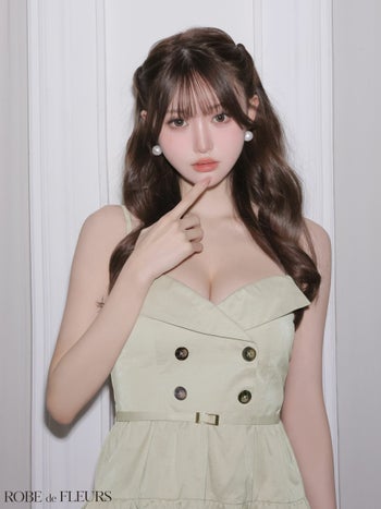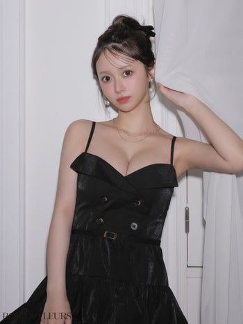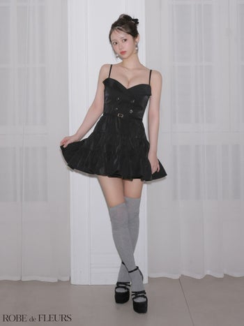 4. 予約商品【2月中旬入荷予定】【ROBEdeFLEURS/ローブドフルール】ウエストベルト 光沢ツイル ティアードフリルスカート キャミソール ダブルボタン フレアミニドレス (fm3491)