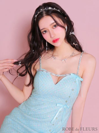 3. 【ROBEdeFLEURS/ローブドフルール】ガーリー オープンバスト ビジュー リボン ラメ キャミソール タイトミニドレス (fm3517)