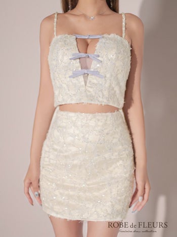 XSあり!唯一無二の素材感♪ 【ROBEdeFLEURS/ローブドフルール】ガーリー オープンバスト キャミソール フェザーレース ミニリボン セットアップ タイトミニドレス (fm3729)