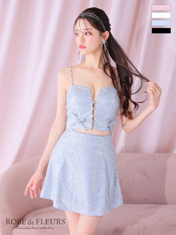 4. 【ROBEdeFLEURS/ローブドフルール】キラキラ キャミソール サイドミニ リボン ビーズ付きスパンコールチュール セットアップ フレアミニドレス(fm3737)