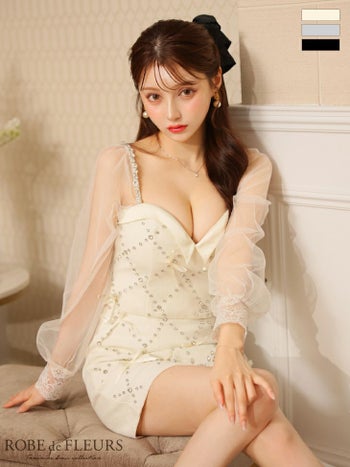 3. 【ROBEdeFLEURS/ローブドフルール】オープンバスト 長袖 袖チュール リボン ビジュー セットアップ ガーリー タイトミニドレス (fm3764)