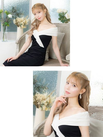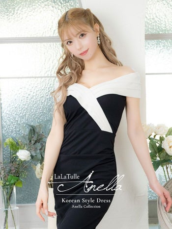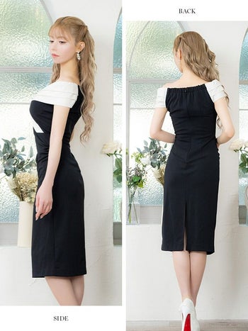 キャバドレス Anella オフショルダー シンプル バイカラー スリット タイト 膝丈ドレス