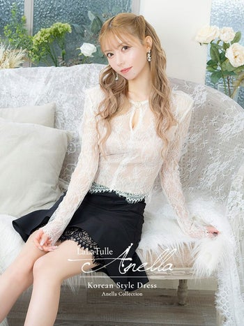 キャバドレス Anella セットアップ レース 長袖 パールボタン バストカット フリル フレアミニドレス