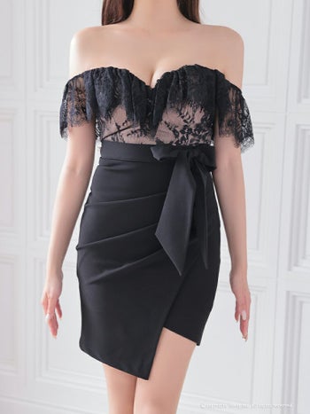 ワンカラー フリル ベルト リボン レース アシンメトリー オフショルダー タイトミニドレスの詳細画像1