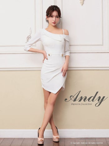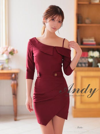 キャバドレス Andy セクシー 袖あり ワンショルダー 襟 ワンカラー ウエストベルト ラップスカート タック タイトミニドレス