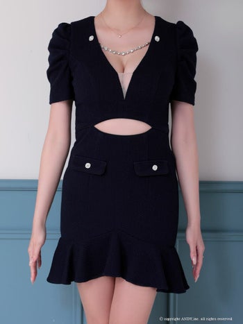 4. 【Andy/アンディ】ウエストカット シースルー 半袖 チェーン パフスリーブ 裾フリル ボタン タイトミニドレス(anon2917)