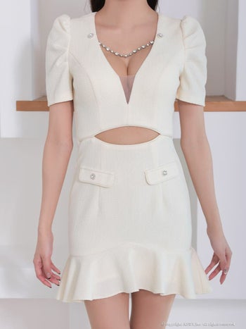3. 【Andy/アンディ】ウエストカット シースルー 半袖 チェーン パフスリーブ 裾フリル ボタン タイトミニドレス(anon2917)