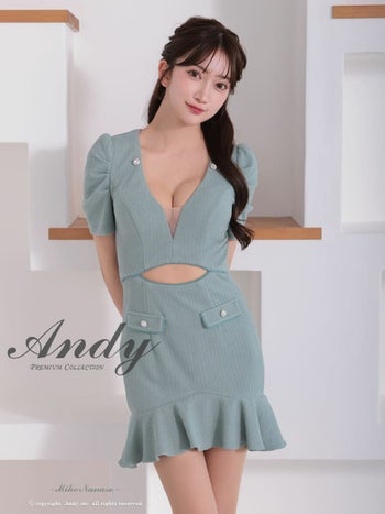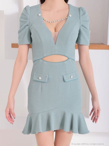 キャバドレス Andy ウエストカット シースルー 半袖 チェーン パフスリーブ 裾フリル ボタン タイトミニドレス