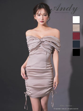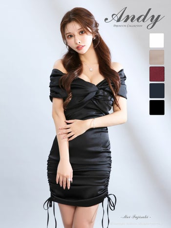 キャバドレス Andy バストクロス オフショルダー ギャザー サテン リボン ドローストリング タイトミニドレス