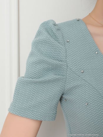 3. 【an/アン】半袖 カットデザイン ワンカラー バストシースルー ビジュー パフスリーブ 飾りポケット フレアミニドレス(aoc3916)