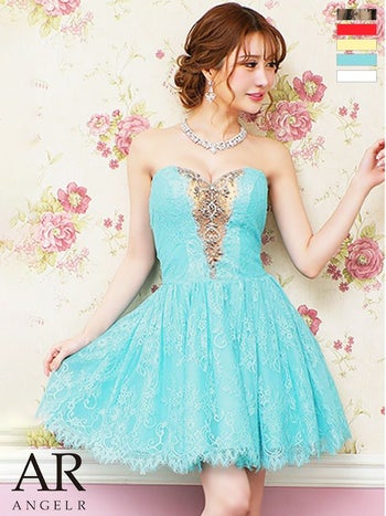 パーティーシーンにも欠かせない一着♪ 【Angel R/エンジェルアール】フェミニン レース×フロント ビジュー ベアトップ フレアミニドレス(AR21313)