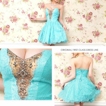 フェミニン レース×フロント ビジュー ベアトップ フレアミニドレス