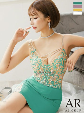 煌めくラインビジューがアクセント☆ 【Angel R/エンジェルアール】キャミソール フラワーレース スパンコール パールビジュー アシンメトリー タイトミニドレス (AR22838)
