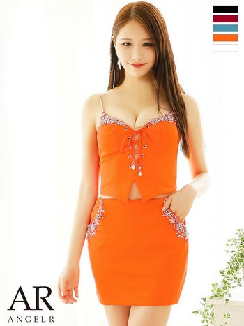 XSあり!スタイルアップ魅せを叶える2ピース☆ 【Angel R/エンジェルアール】セットアップ レースアップ バストポケットビジュー タイトミニドレス (AR24314)