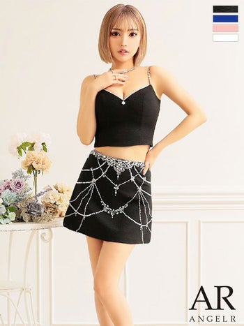 XSあり!煌めくビジューが存在感抜群☆ SALE【Angel R/エンジェルアール】スカートビジュー パール キャミソール フラワーチャーム ツイード セットアップ フレアミニドレス (AR24319)