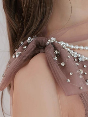 3. 【Angel R/エンジェルアール】シアー ウエストカット ビジュー ネックパール ショルダーリボン ワンショルダー メッシュ タイトミニドレス (AR25869)