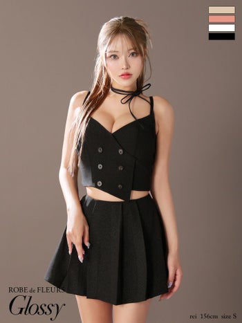 3. 【Glossy by ROBE de FLEURS/グロッシー】キャミソール オープンバスト プリーツ セクシー ダブルボタン セットアップ チョーカー付き フレアミニドレス (GL3289)