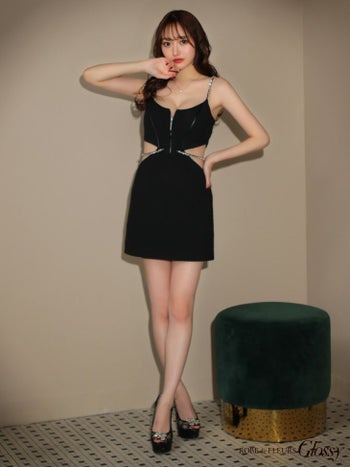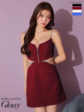 XSあり!短め丈から見えるウエストがポイント! 【Glossy by ROBE de FLEURS/グロッシー】キャミソール ウエストビジュー カット フロントジッパー ペチコート付き 台形スカート フレアミニドレス(GL3508)