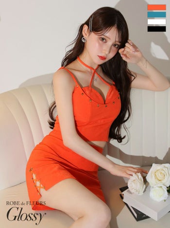 XSあり!バストアップが叶う☆ SALE【Glossy by ROBE de FLEURS/グロッシー】フロントクロス スタッズ セットアップ セクシー キャミソール スエード タイトミニドレス (GL3542)