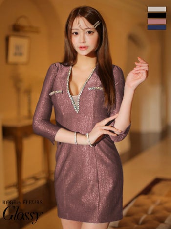 4. 【Glossy by ROBE de FLEURS/グロッシー】セクシー オープンバスト 長袖 ラメ ビジュー タイトミニドレス (GL3560)