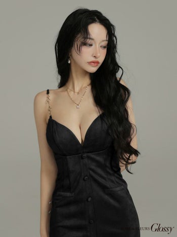 3. 【Glossy by ROBE de FLEURS/グロッシー】フロントボタン フェイクスエード セクシー キャミソール オープンバスト タイトミニドレス (GL3944)