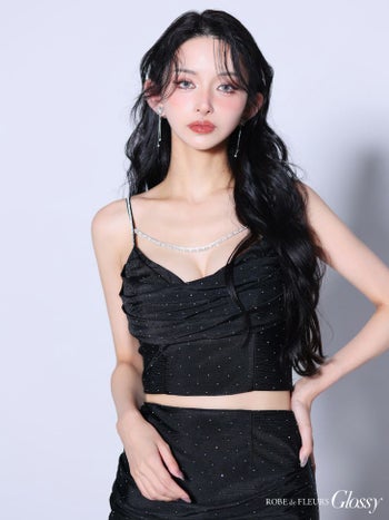 3. 【Glossy by ROBE de FLEURS/グロッシー】チェーンストラップ サテン キャミソール ストーン セットアップ ドレープ タイトミニドレス (GL3952)