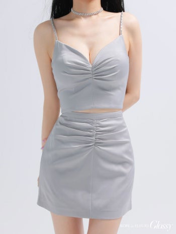 XSあり!サテンが高級感たっぷり♡ 【Glossy by ROBE de FLEURS/グロッシー】ギャザー サテン キャミソール セットアップ シンプル ワンカラー タイトミニドレス (GL4130)