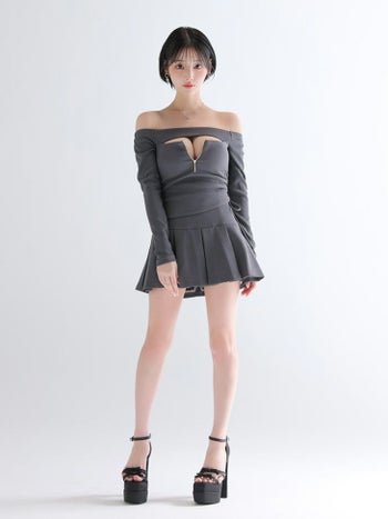 3. 【Glossy by ROBE de FLEURS/グロッシー】リブ プリーツスカート オフショルダー 長袖 セットアップ ジップデザイン バストカット フレアミニドレス (GL4138)