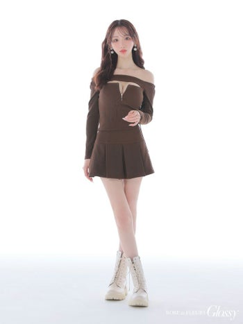 5. 【Glossy by ROBE de FLEURS/グロッシー】リブ プリーツスカート オフショルダー 長袖 セットアップ ジップデザイン バストカット フレアミニドレス (GL4138)