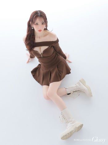 4. 【Glossy by ROBE de FLEURS/グロッシー】リブ プリーツスカート オフショルダー 長袖 セットアップ ジップデザイン バストカット フレアミニドレス (GL4138)